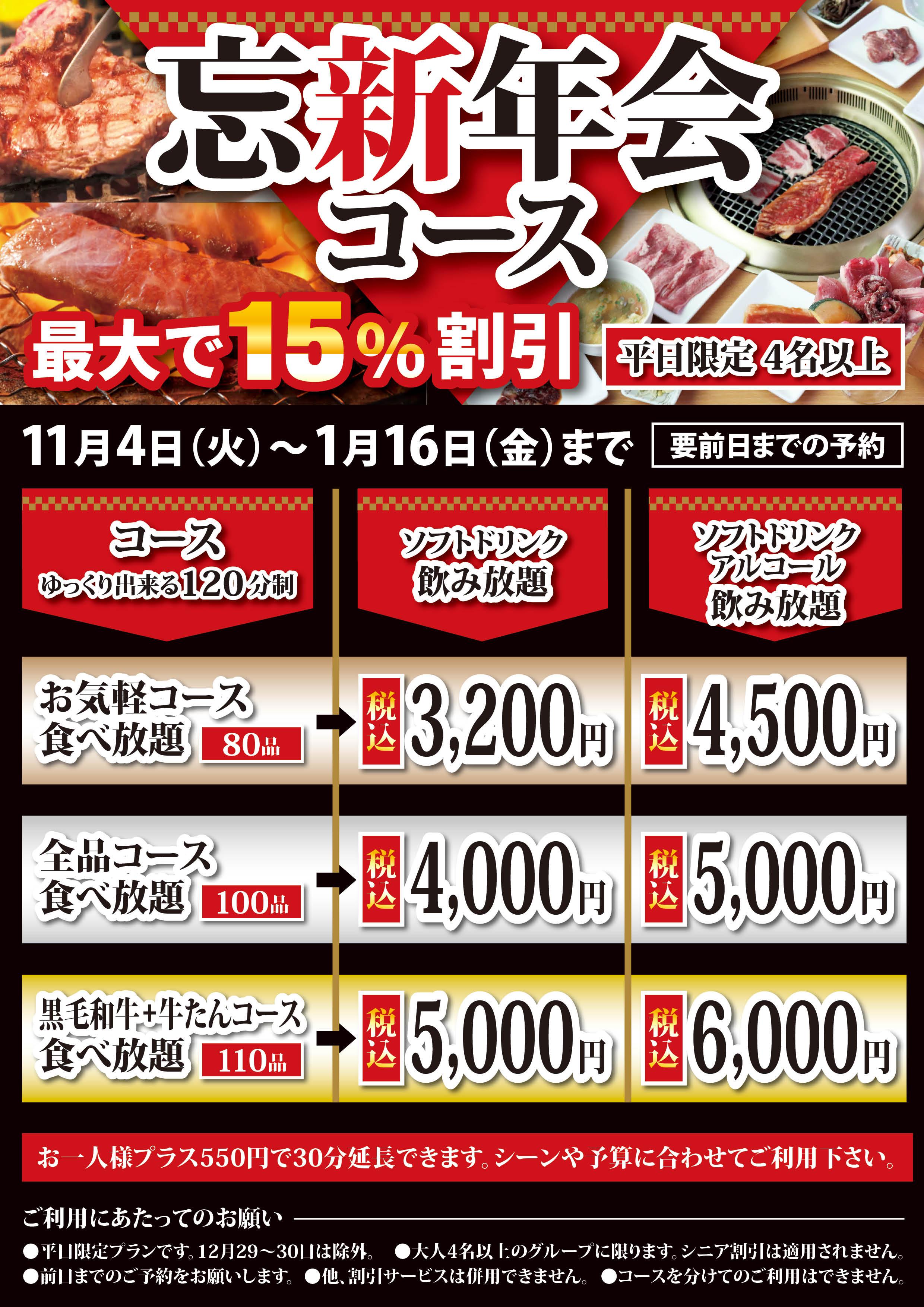 11月4日から忘新年会コースがスタート!平日限定の大変お得なコースですので是非ご利用ください。詳細は下記の画像からご確認ください。 |