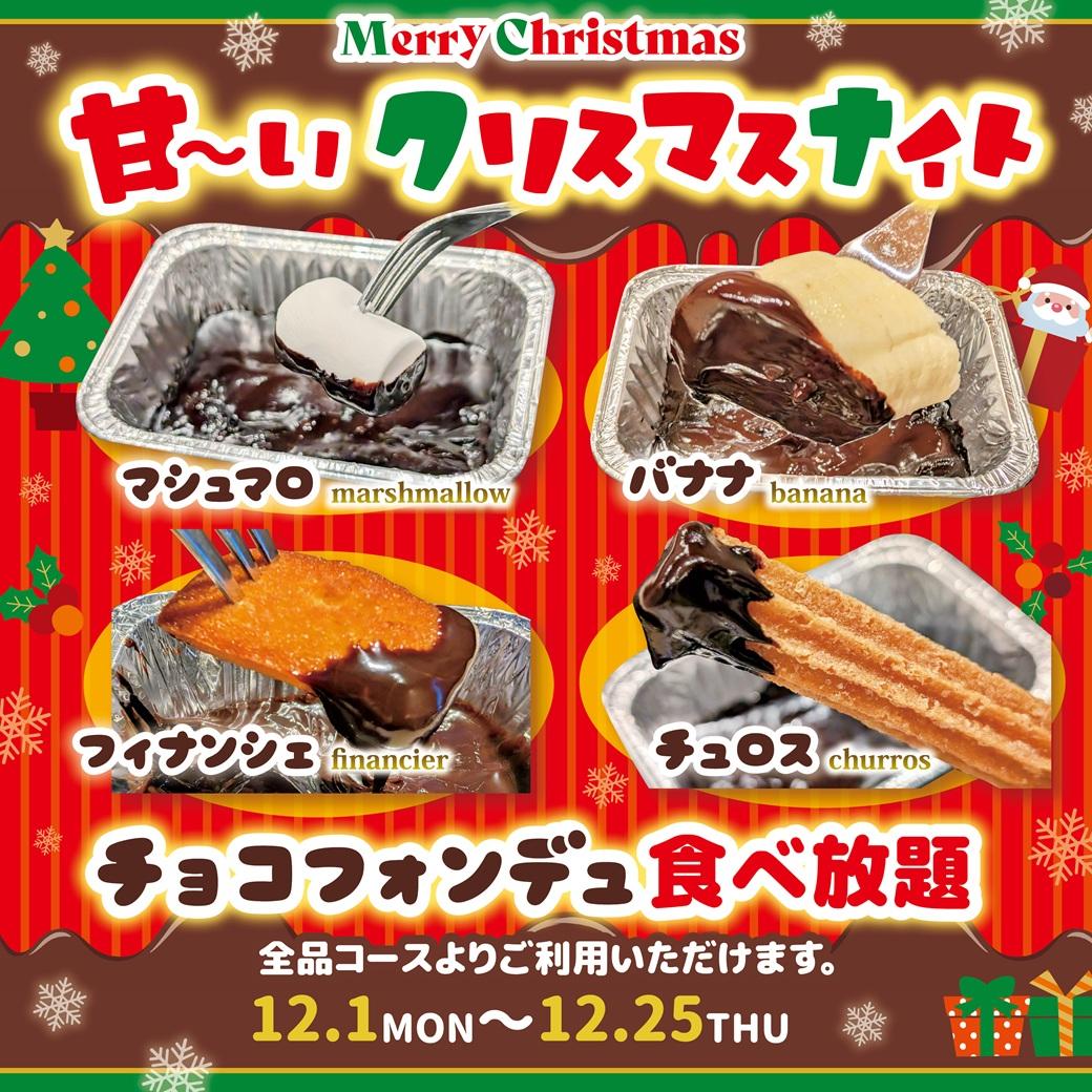 12月1日~25日まで、甘~いクリスマスナイト開催!全品コースからチョコフォンデュで食べるマシュマロやチュロスが登場します! |